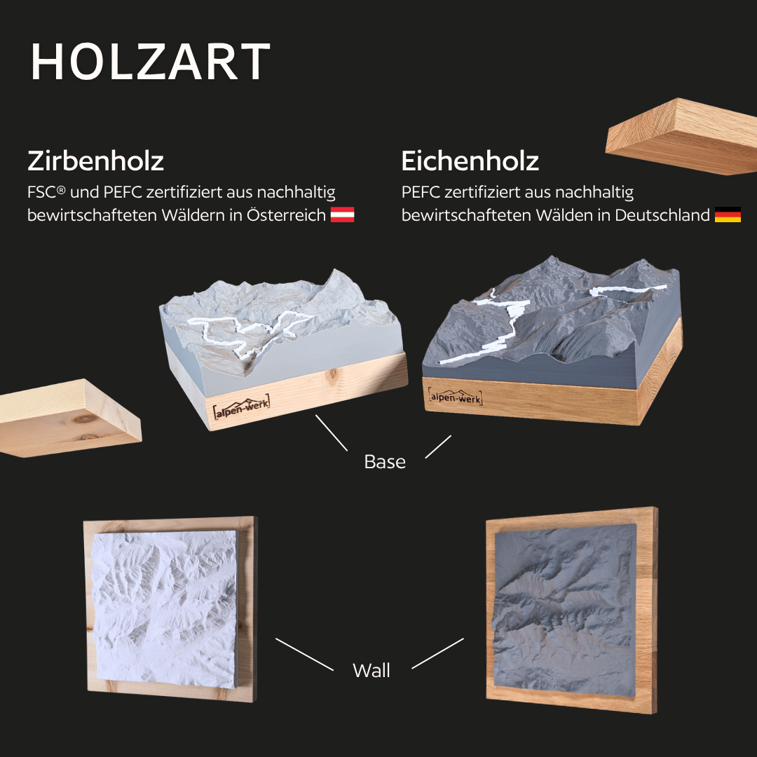 Unsere Reliefs bestehen aus einem hochwertigen biobasierten Kunststoff, der für präzise Details sorgt, und sind auf einemmassiven Holzsockel aus regionaler, nachhaltiger Forstwirtschaft montiert. Der Sockel ist geölt, um die natürliche Holzmaserung hervorzuheben.