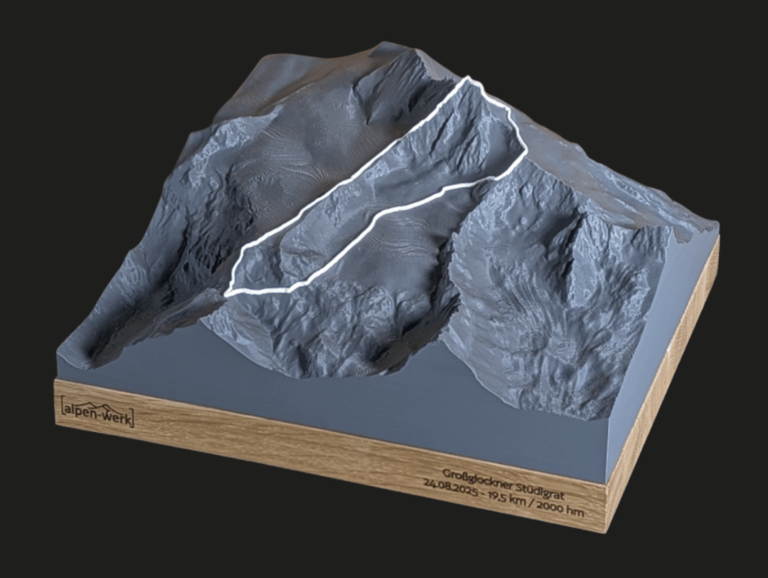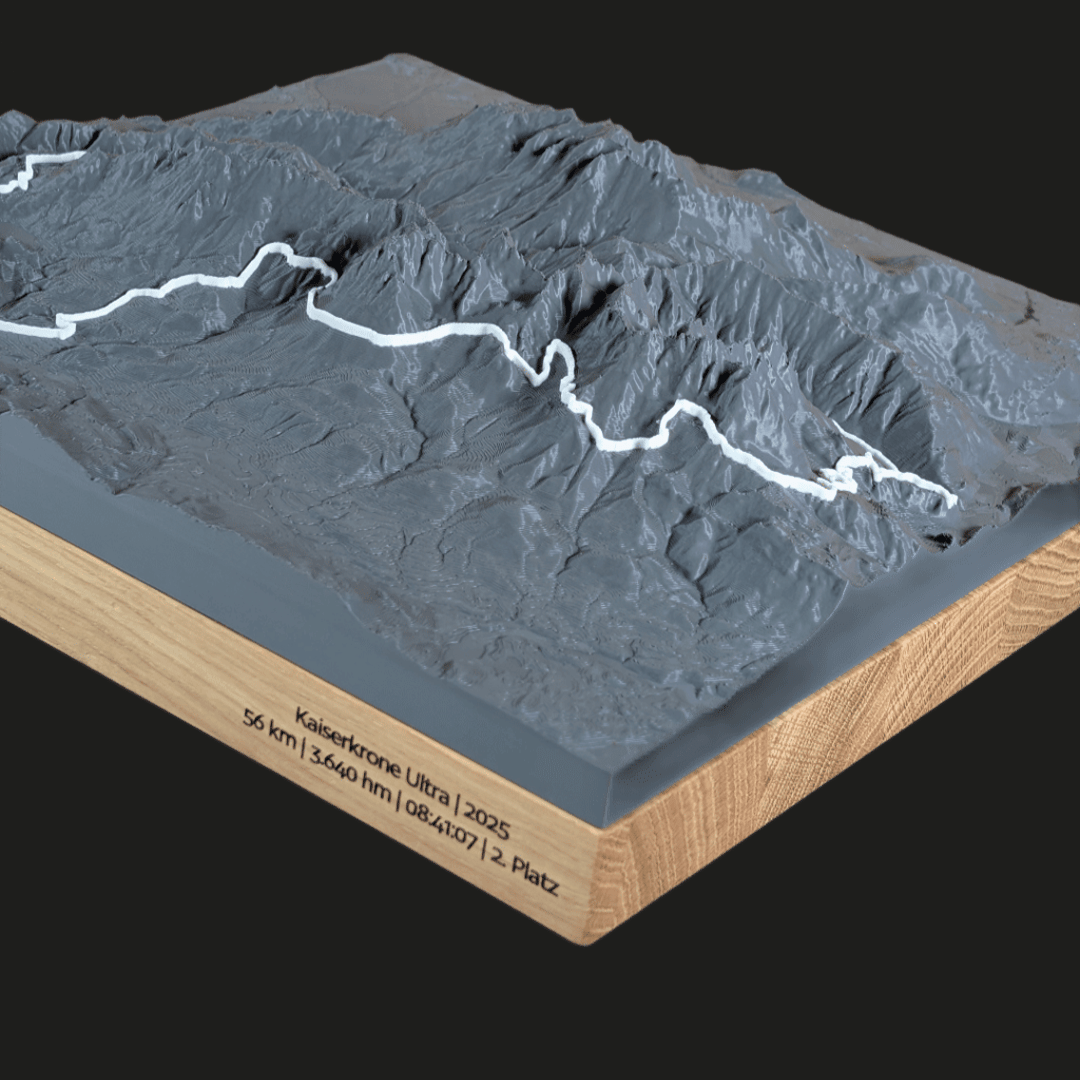 Dein GPX-Track – präzise modelliert auf echten Höhendaten. Ob Solo-Abenteuer oder gemeinsame Tour – Dein Weg wird detailgetreu ins Relief gedruckt.