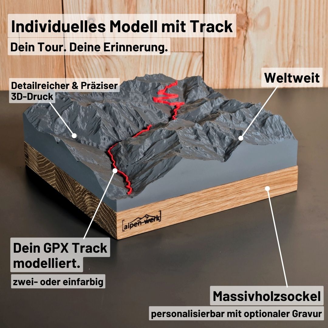 Wir modellieren Deine individuelle Route präzise auf Dein Bergrelief – ein echtes Unikat, das Deine Tour für immer festhält. Ob Solo-Abenteuer oder gemeinsame Herausforderung mit Freunden – Dein Track wird individuell für Dich modelliert und detailgetreu dargestellt.