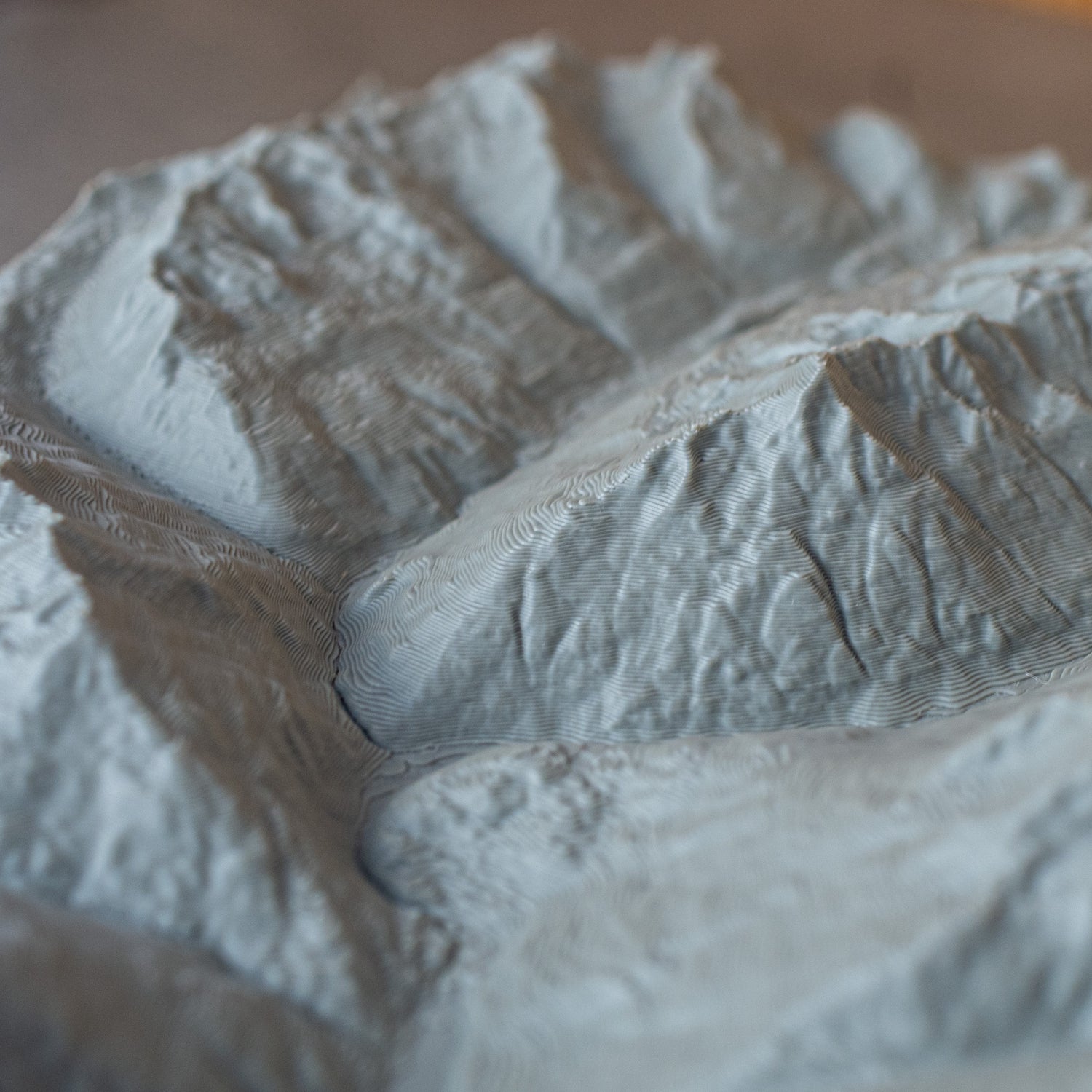 Unsere 3D-Reliefs basieren auf exakten Geodaten und werden mit modernster 3D-Drucktechnologie gefertigt. Dadurch werden selbst kleinste Höhenunterschiede sichtbar. Die Reliefs sind maßstabsgetreu, sodass markante Gipfel, Täler und Strukturen realistisch dargestellt werden.